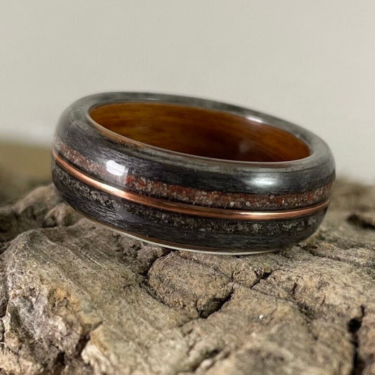 Steel Ring with Dinosaur Bone, Tektite Meteorite, Grey Maple and a Copper