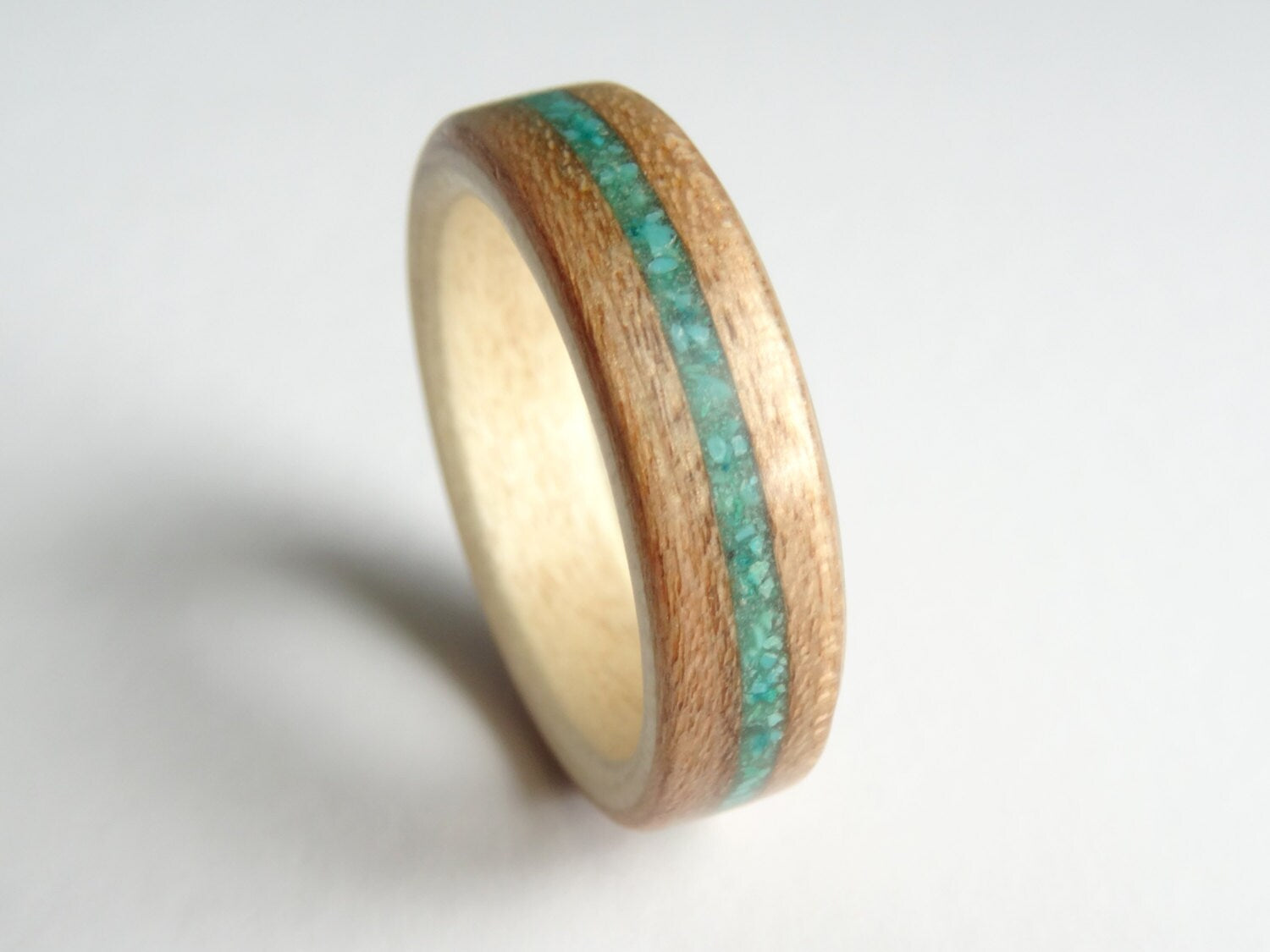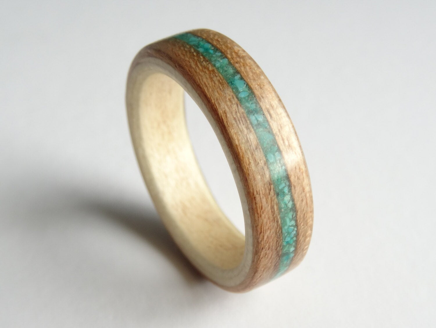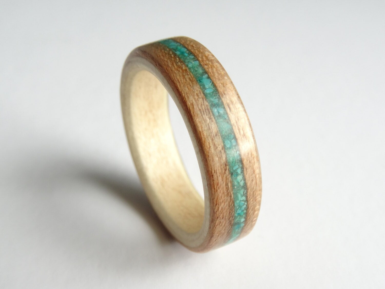 A unique bent wood ring, handmade to order with Cherry, Sycamore and a crushed turquoise inlay.