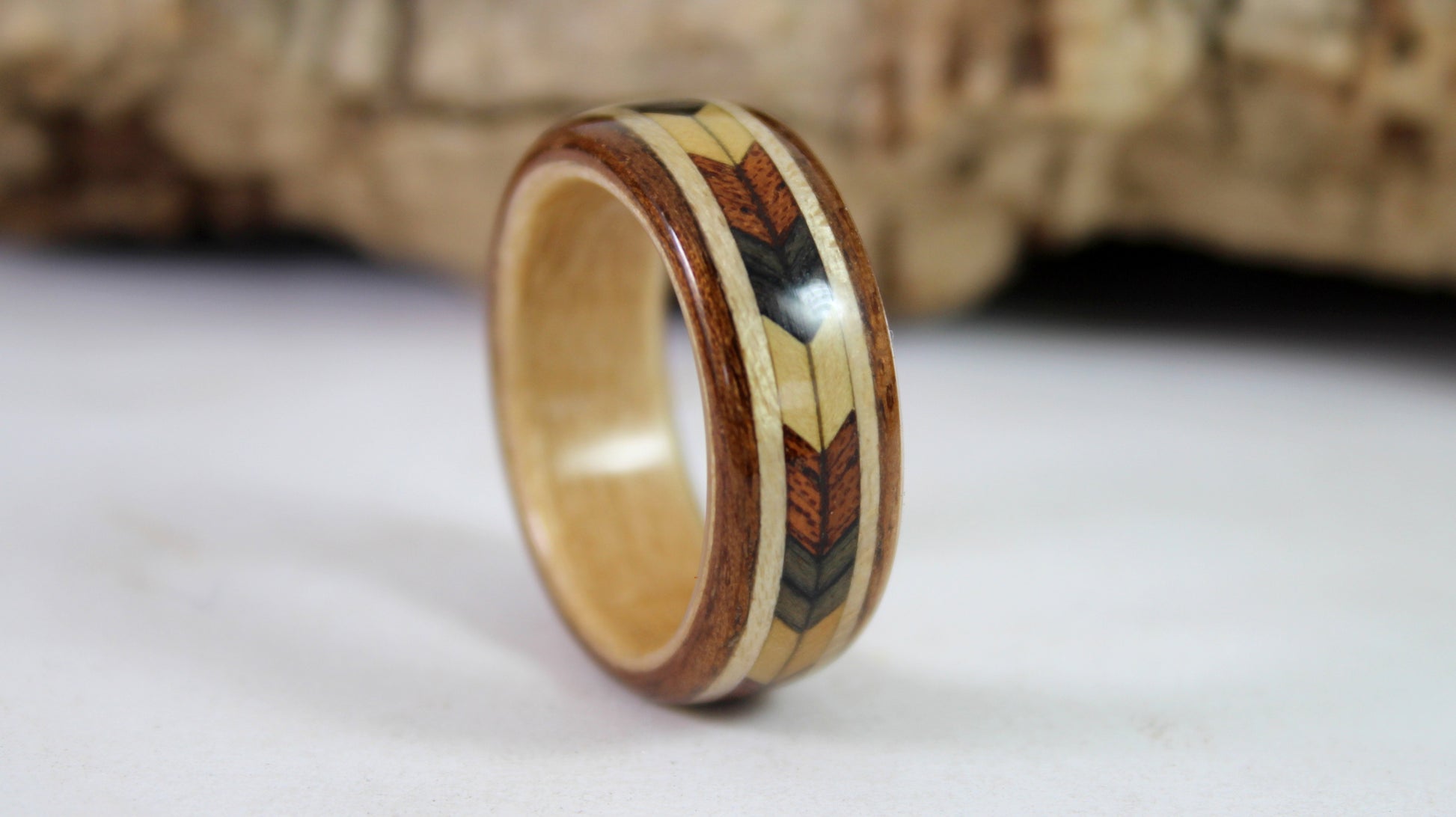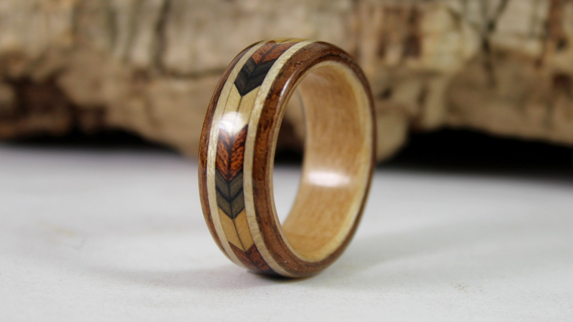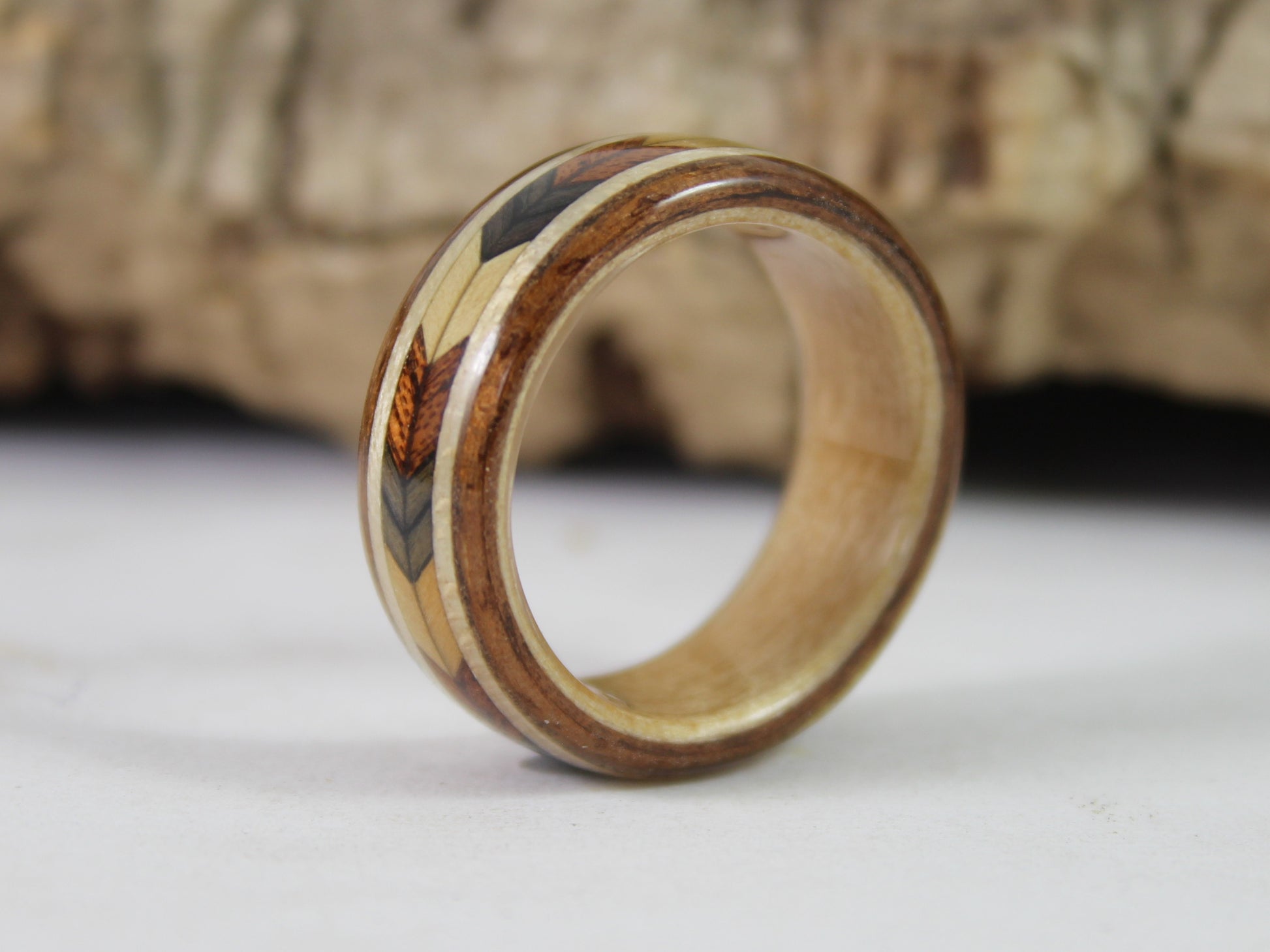 A unique wooden ring with a chevron pattern inlay handmade in any size with free worldwide shipping.