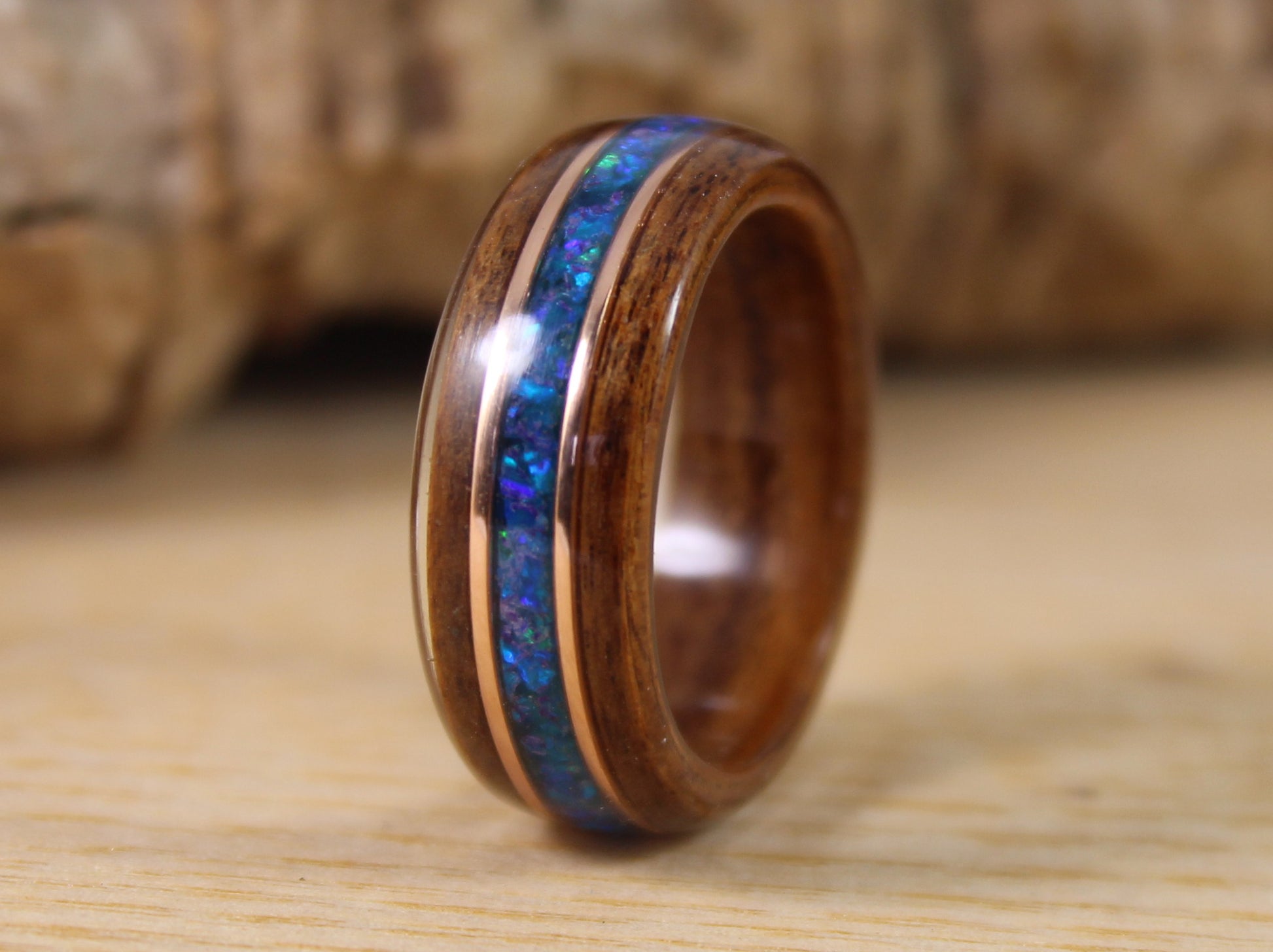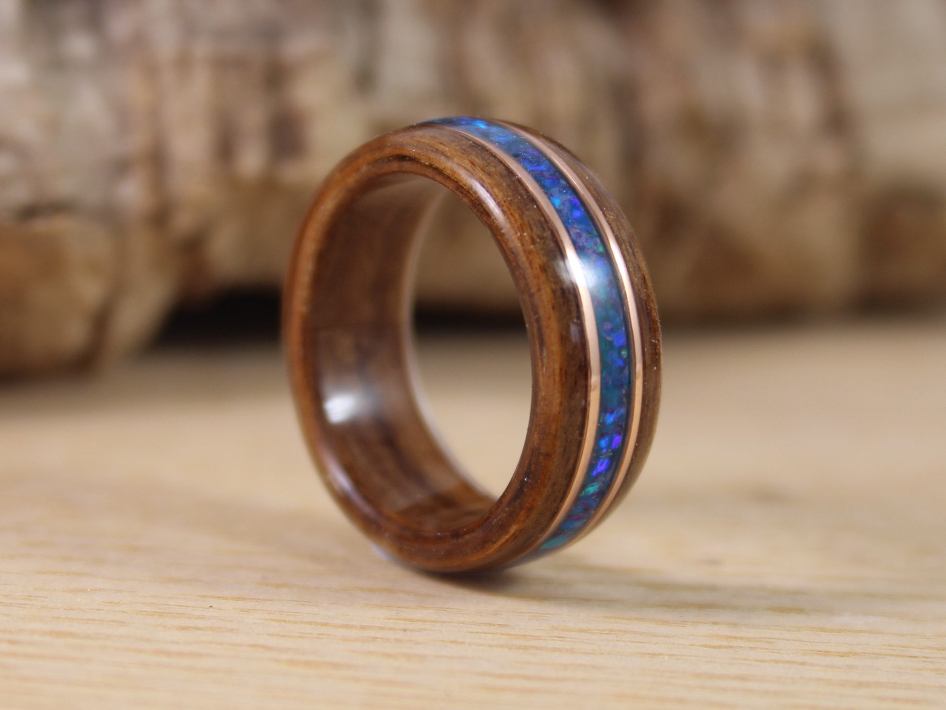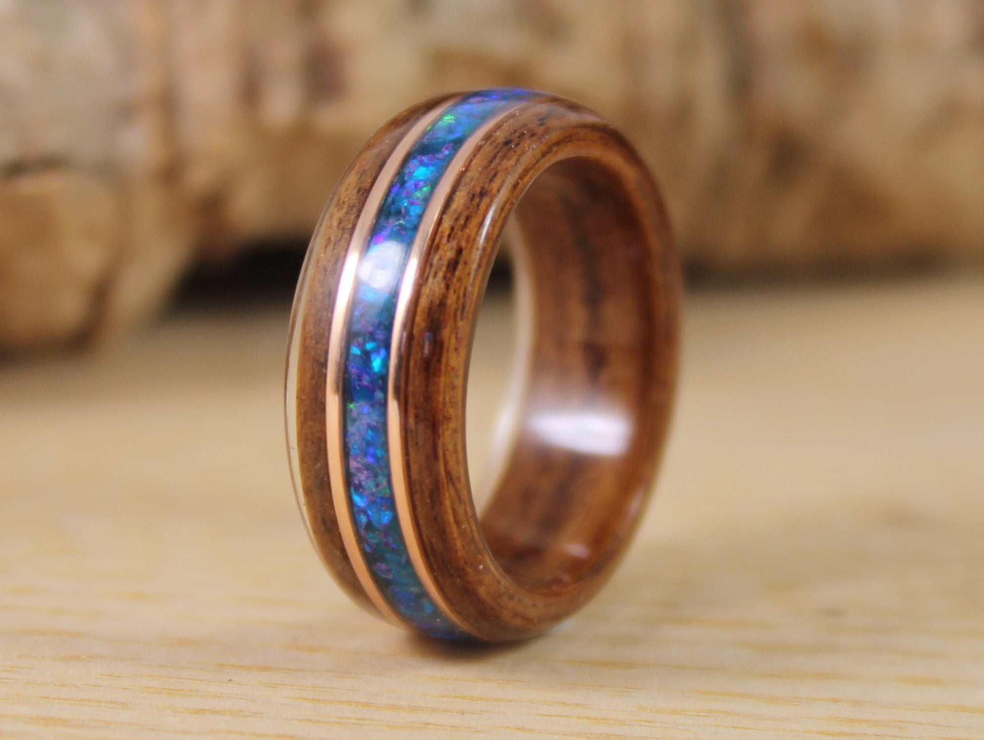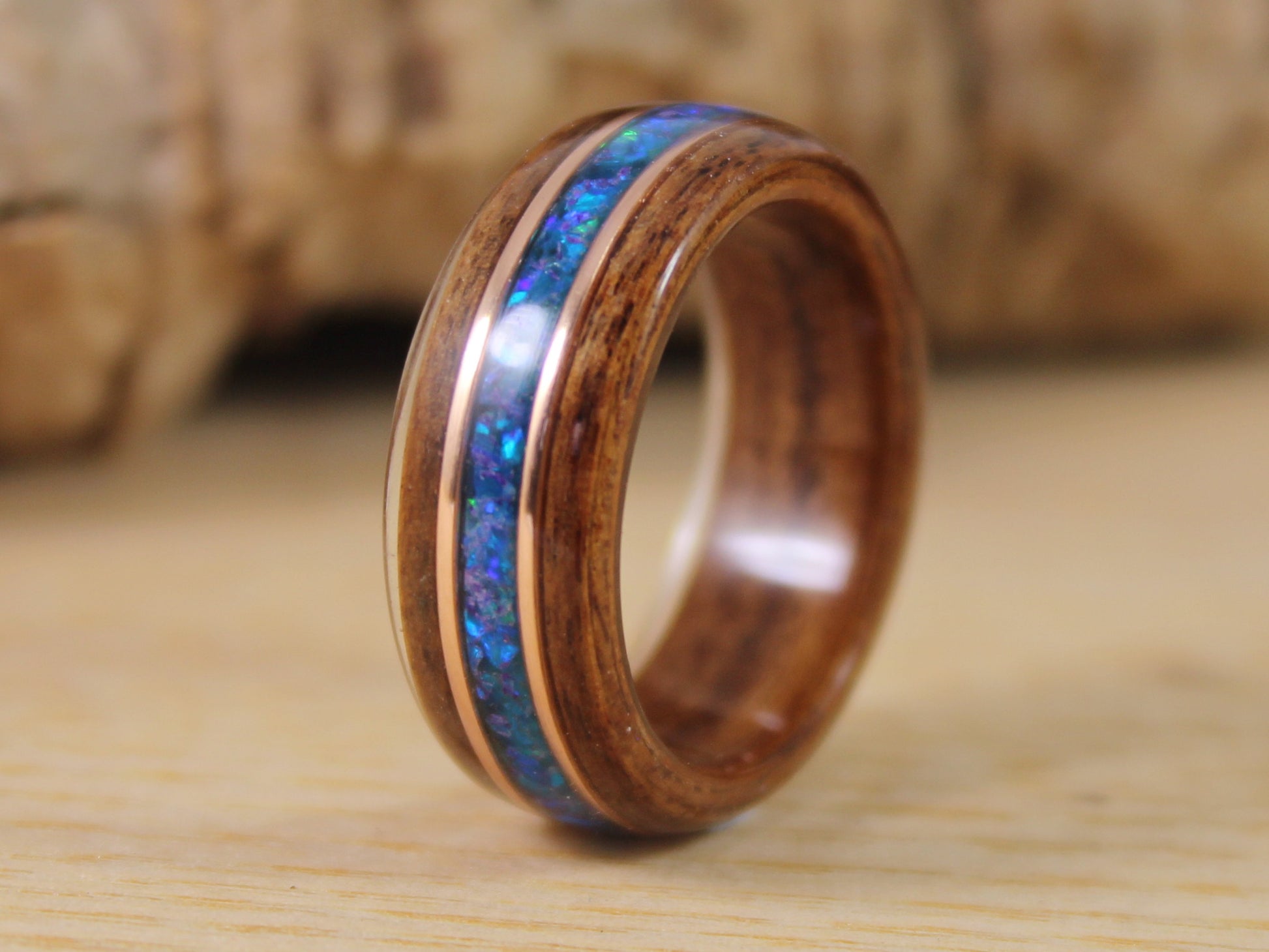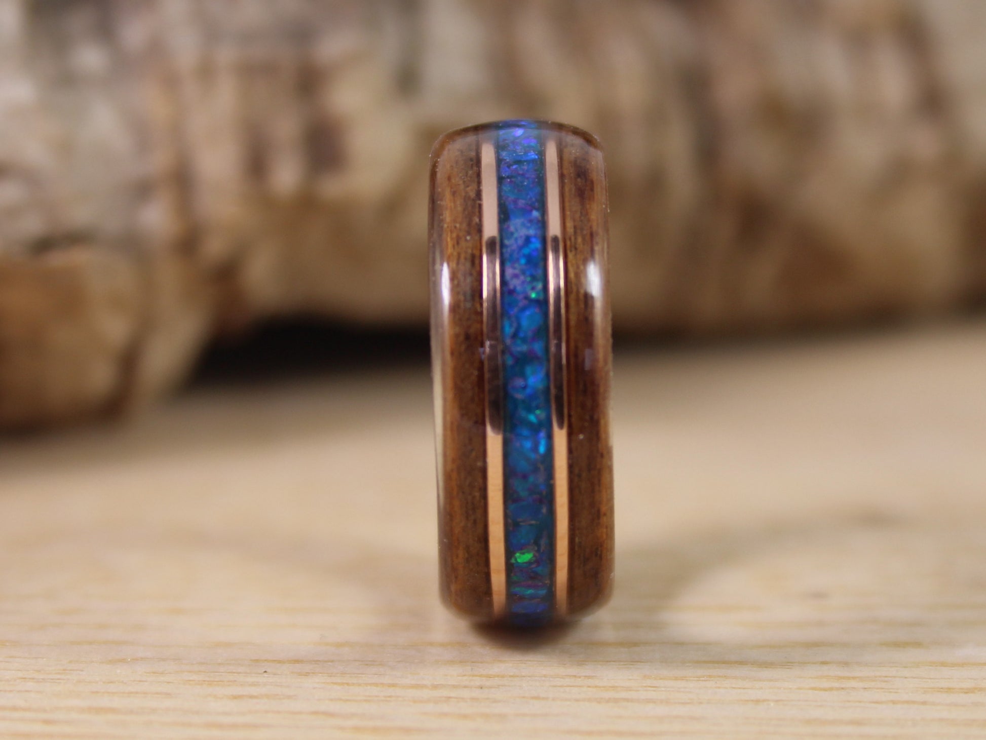 Rosewood Bent Wood Ring with Blue Opal and Rose Gold Pinstripes