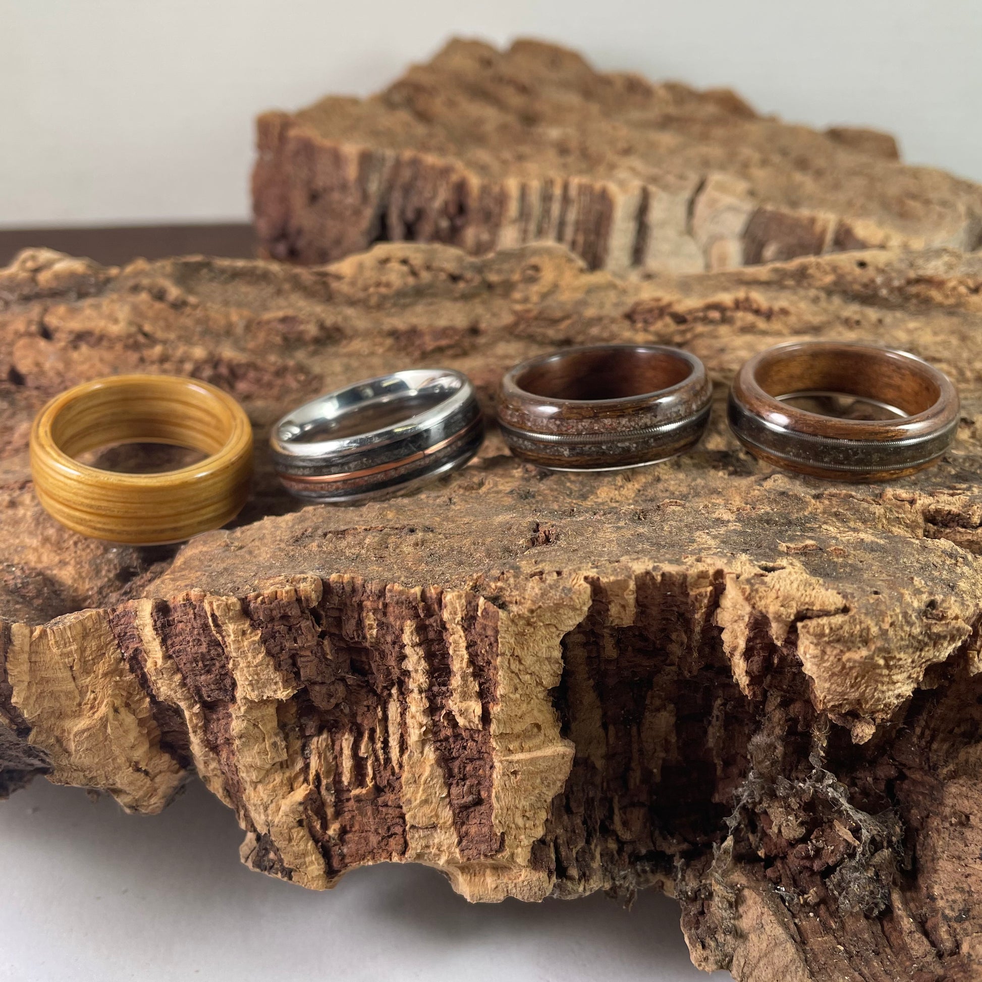 Wood grain Damascus ring with offset green opal/ashes mix inlay: UK V, US size 10.75, 6mm wide