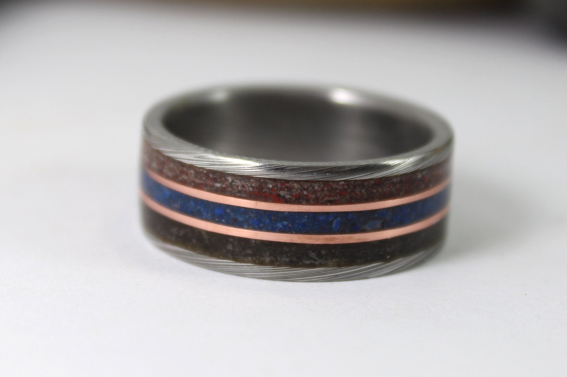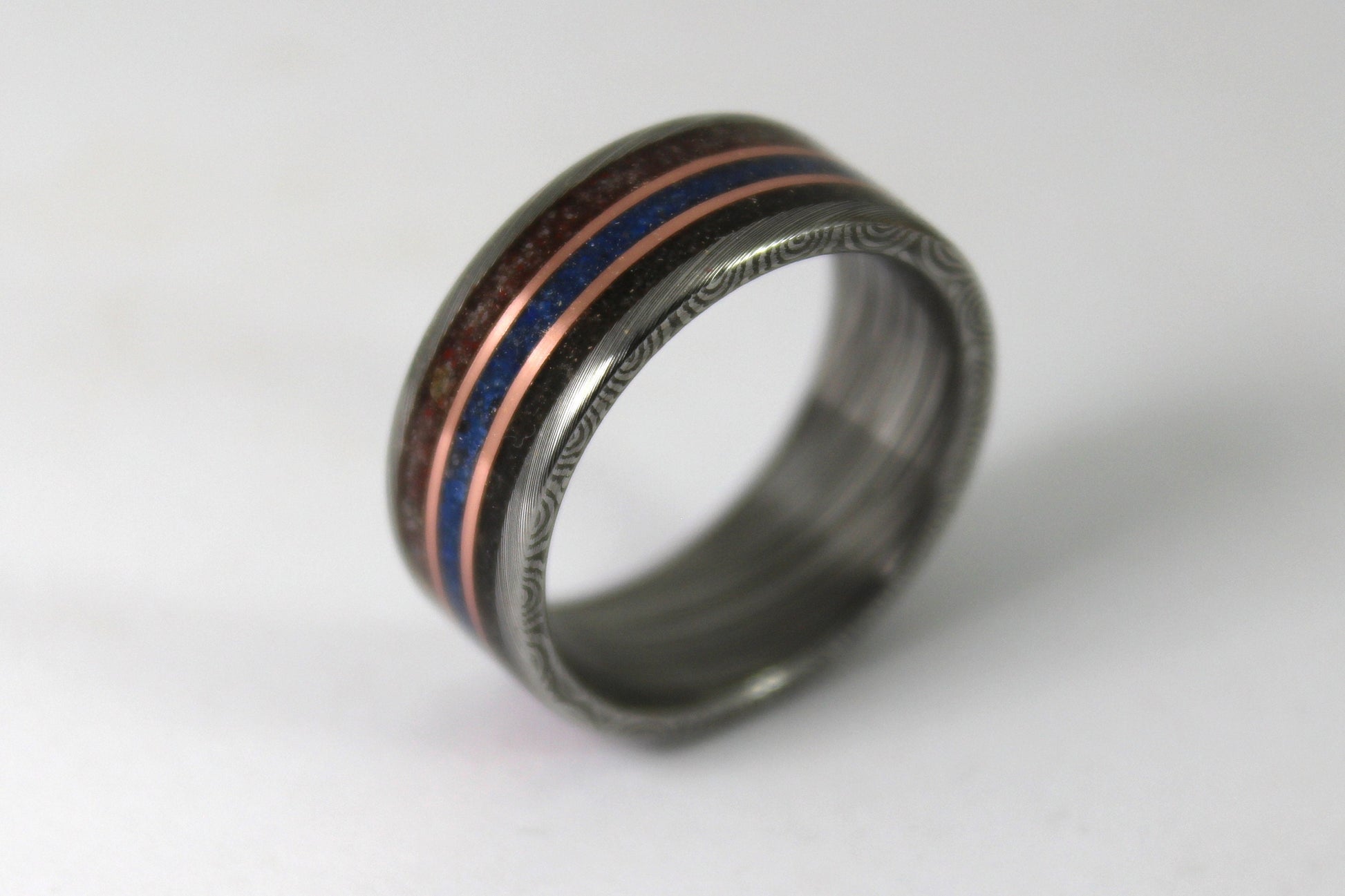 Damascus Steel Ring With Meteorite, Dinosaur Bone, Blue Lapis and Copper