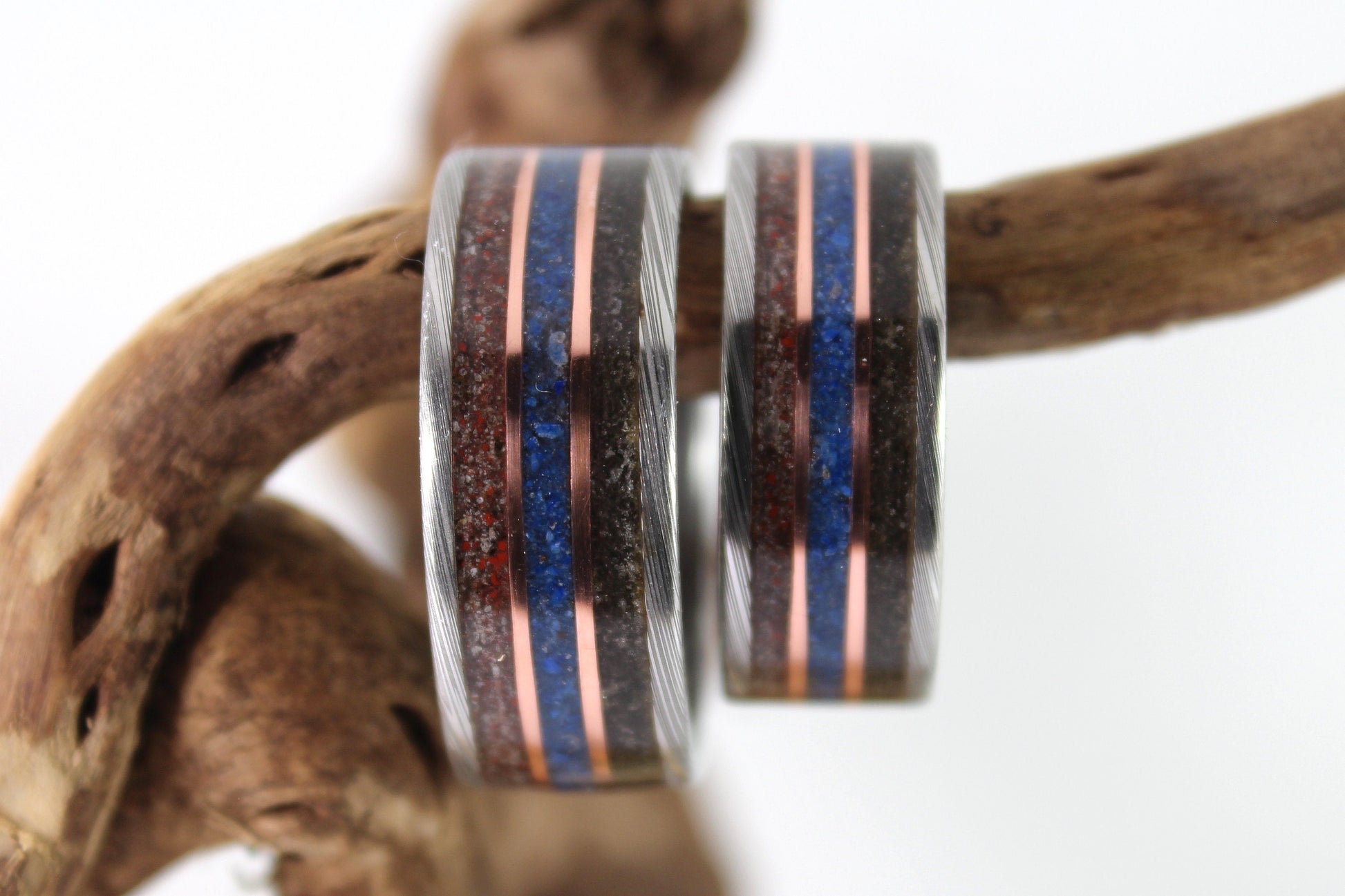 Lapis Lazuli brings a splash of deep blue through the middle of the band and two copper pinstripes separate all of the inlays.