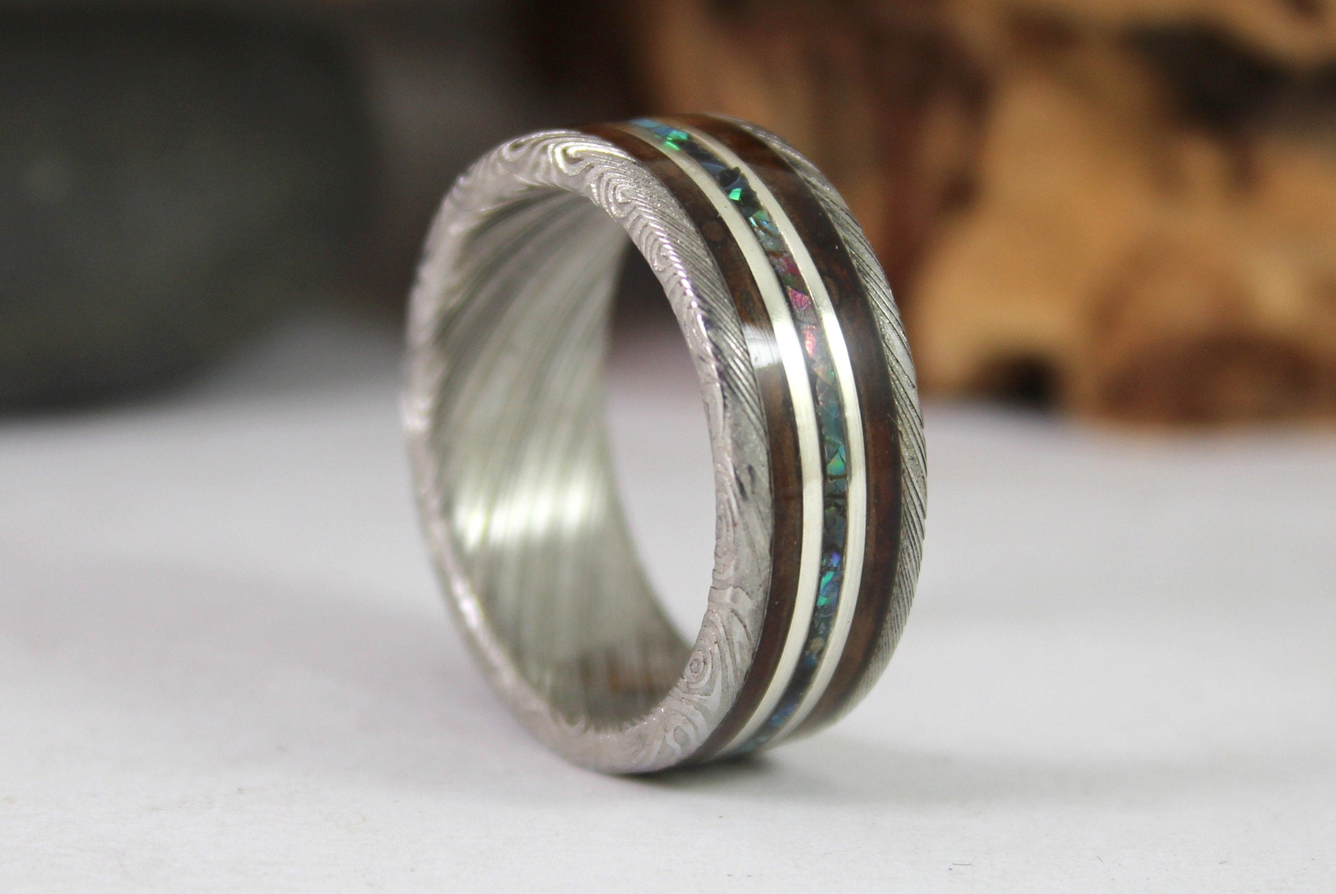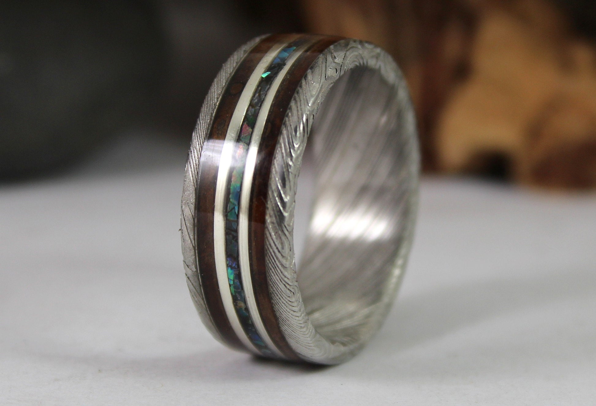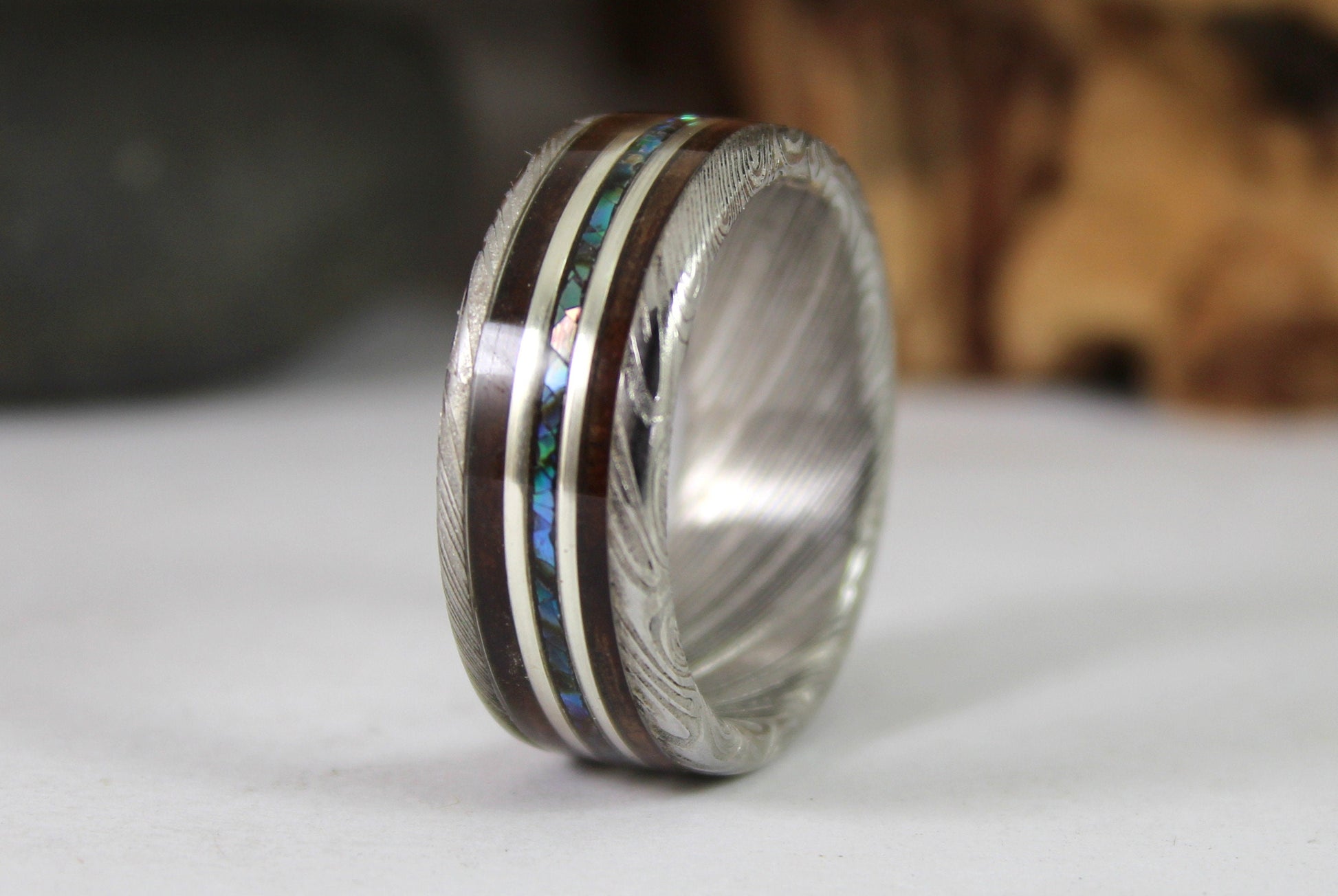Damascus Steel Ring with Wood, Abalone Shell and Silver