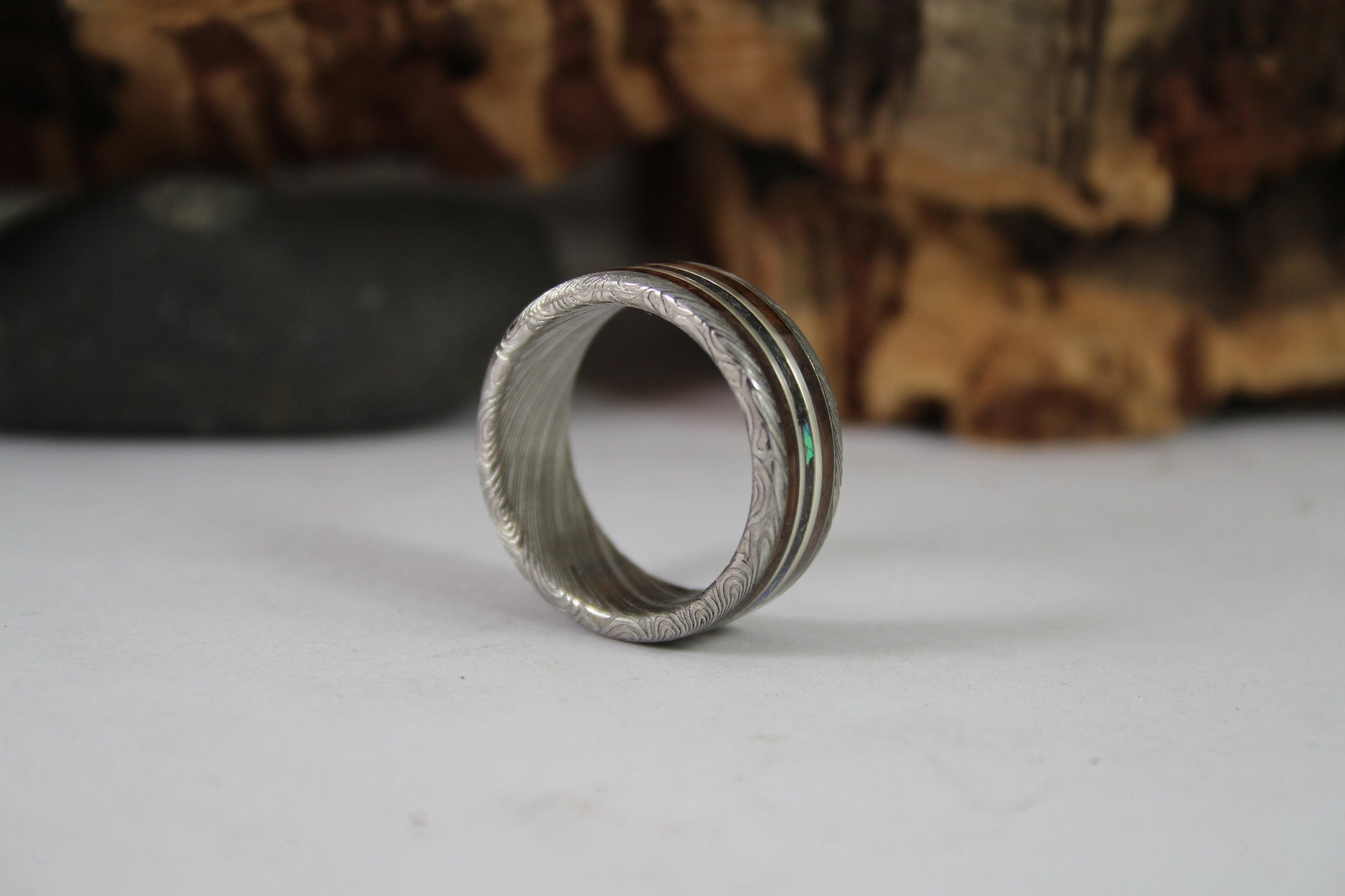 Damascus Steel ring with wood, abalone shell and silver pin stripes. Handmade to order in your size with free shipping worldwide.