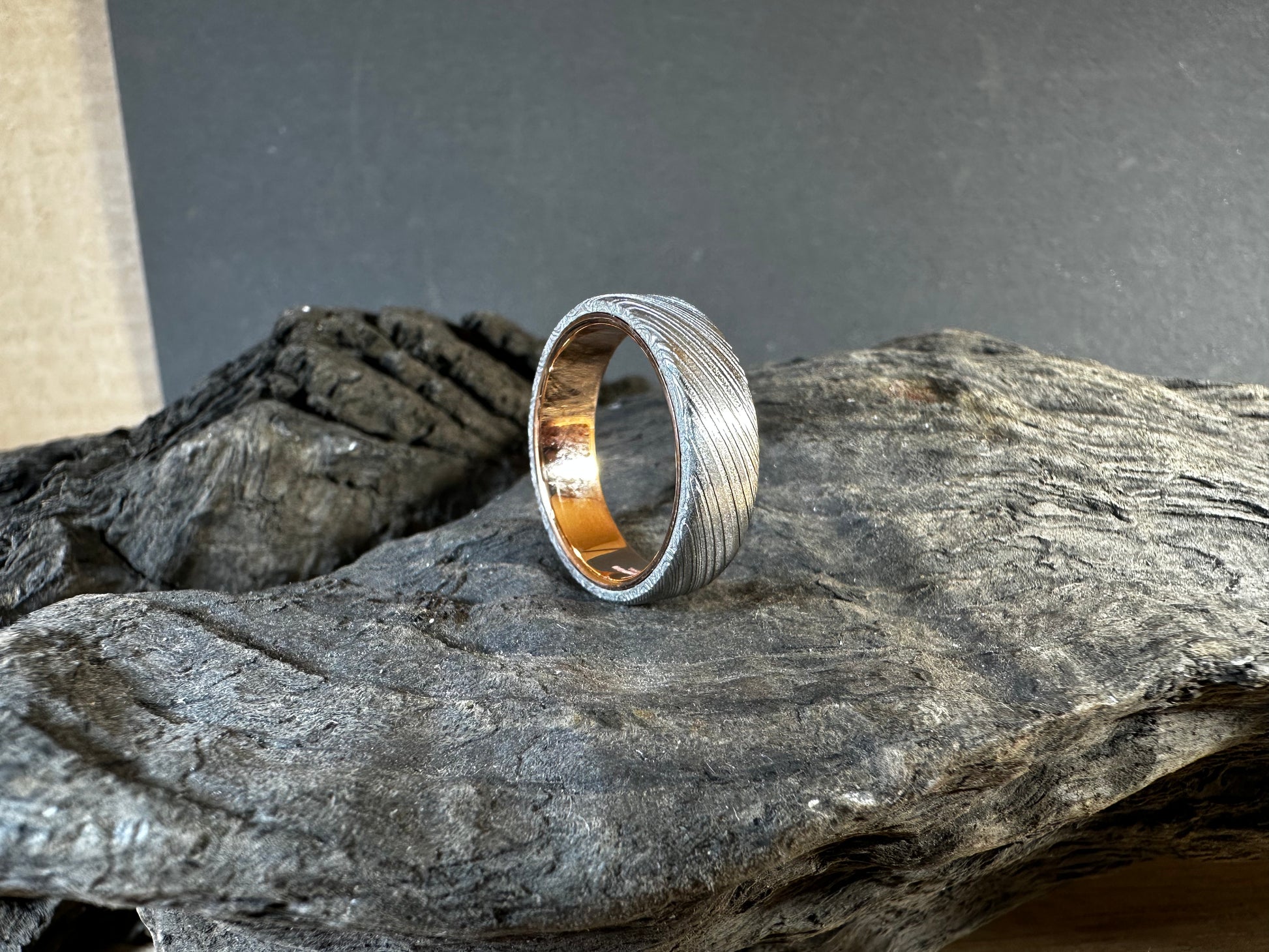 Dense Twist Damascus Steel Ring with 9ct Rose Gold Inside