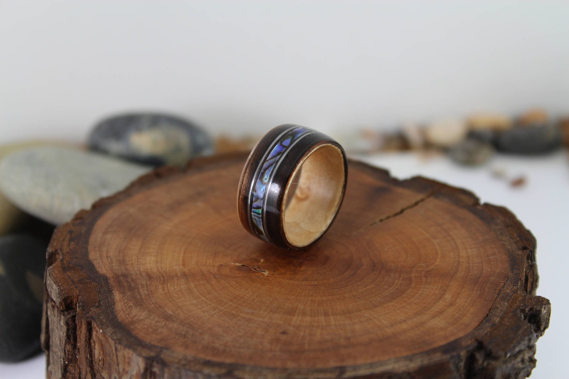Ebony & Maple With Abalone + Guitar Strings Bent Wood Ring