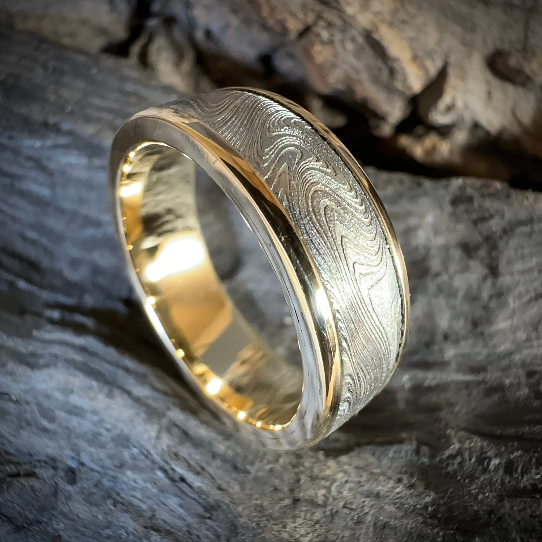 Combining the luxury of gold with artisan made Damascus steel that was forged specifically for the jewellery trade by master blacksmith Chris Ploof.