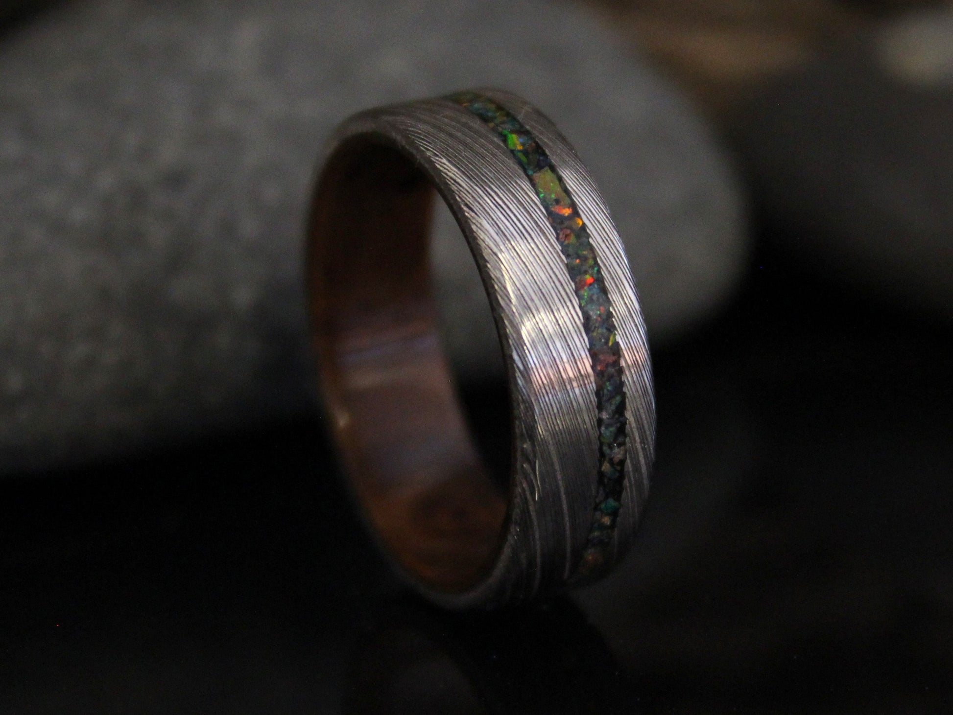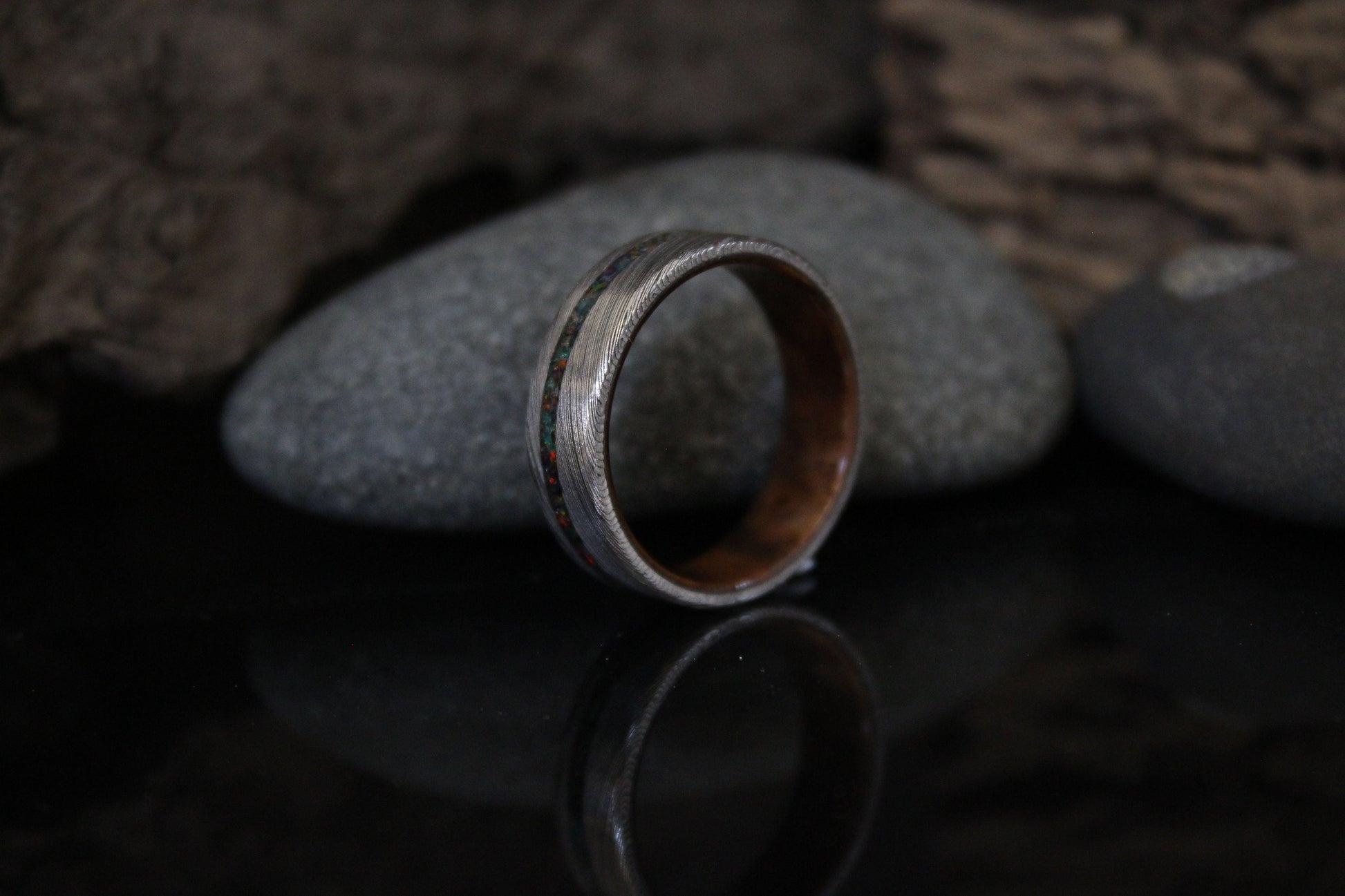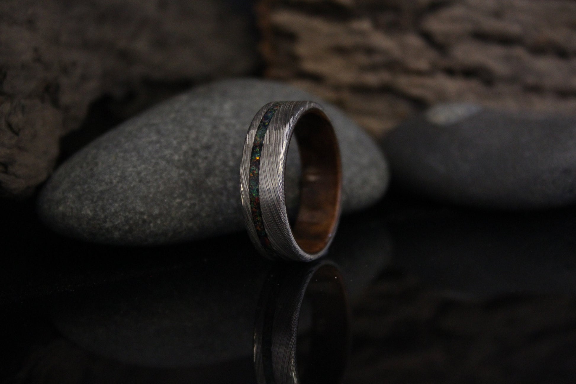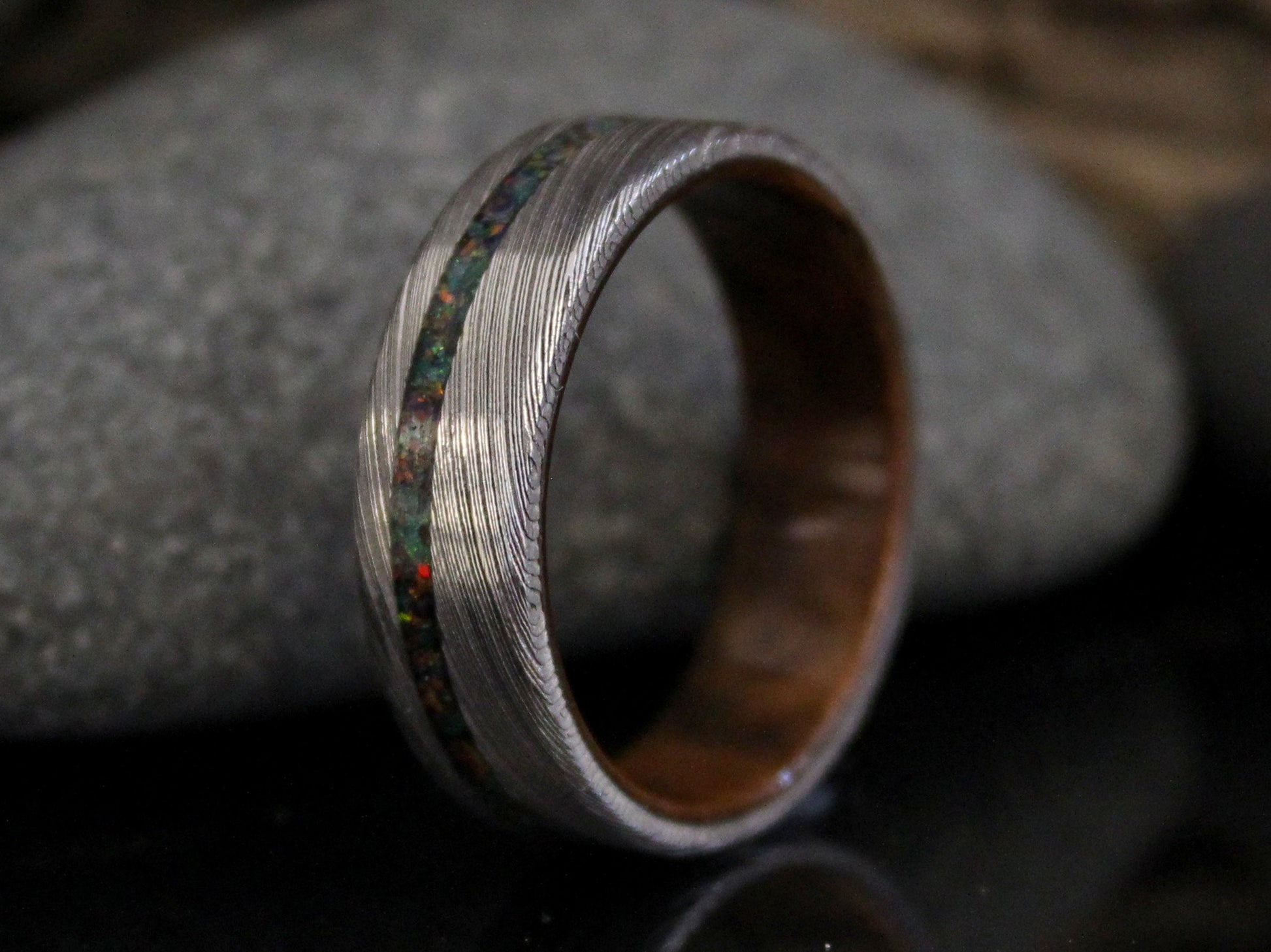 Stainless Damascus steel ring with walnut burl inside and black opal inlay. Handmade to order in your size with free shipping worldwide.