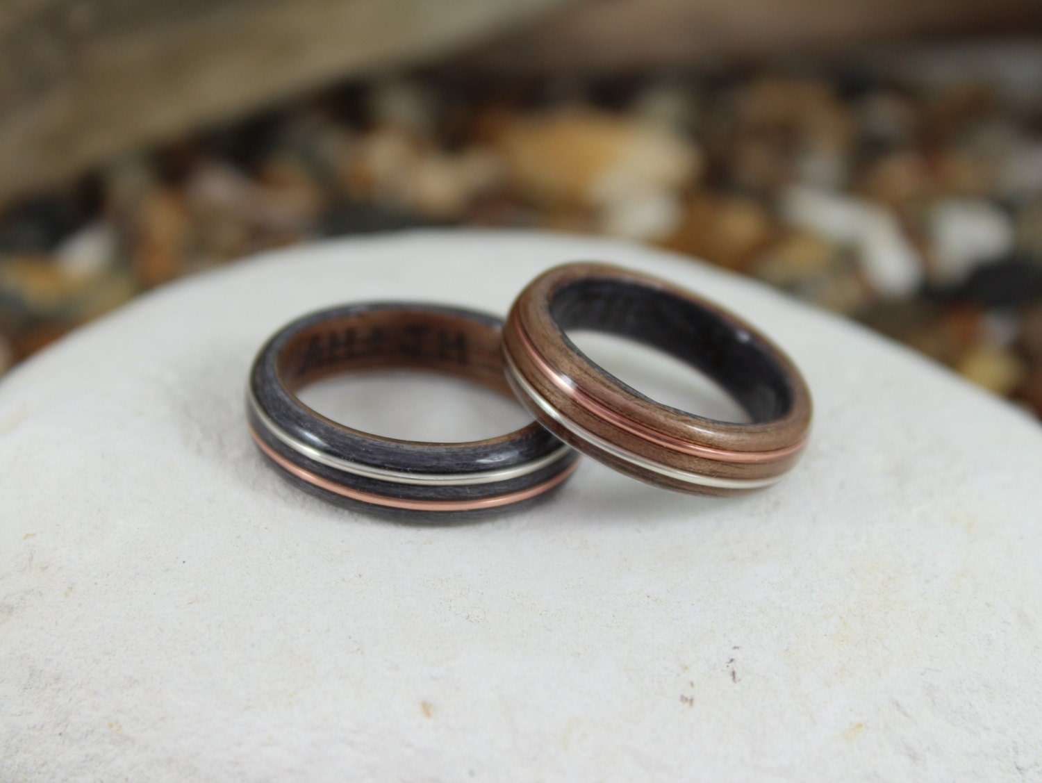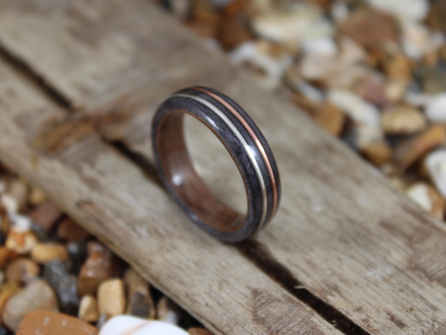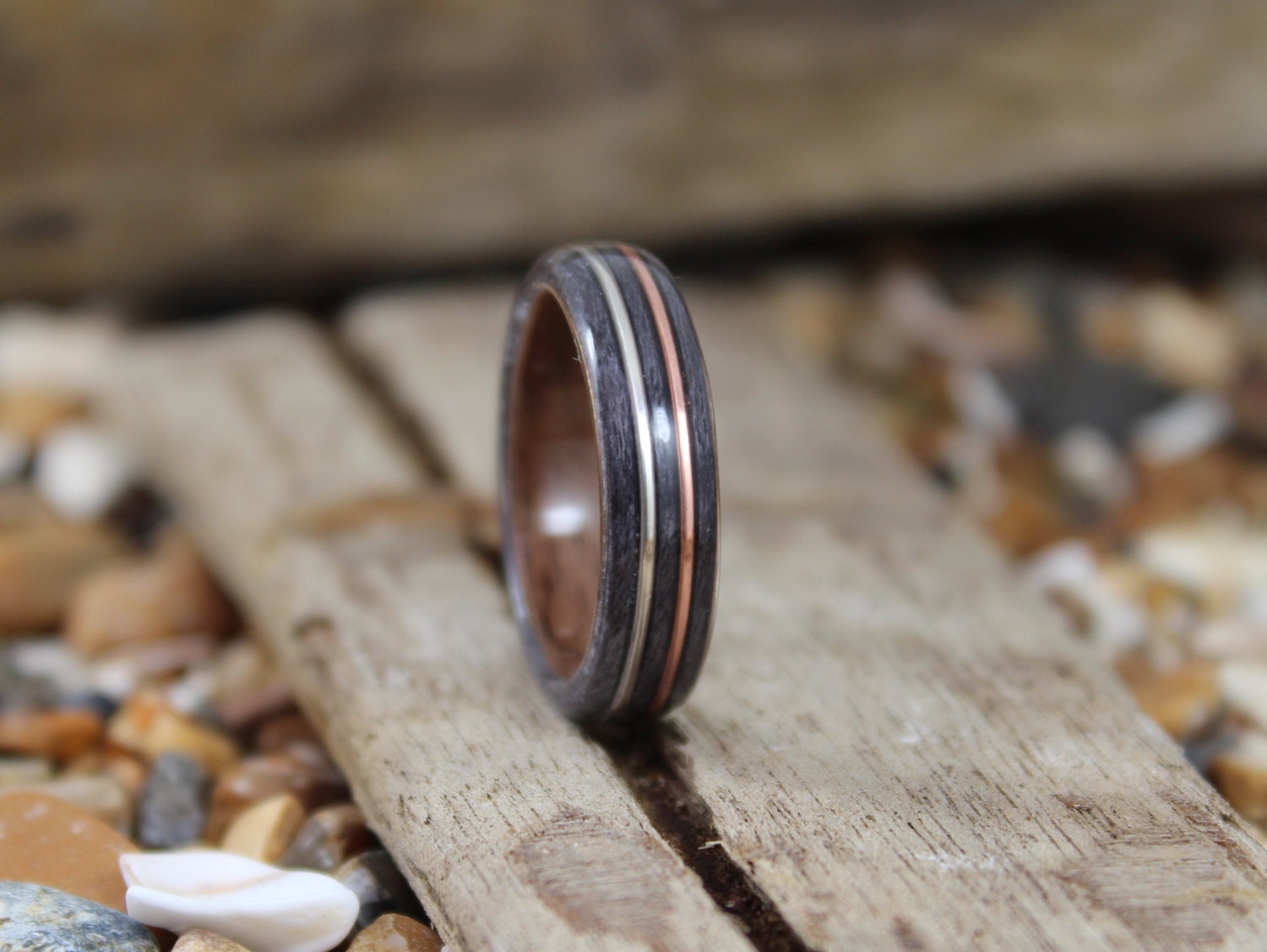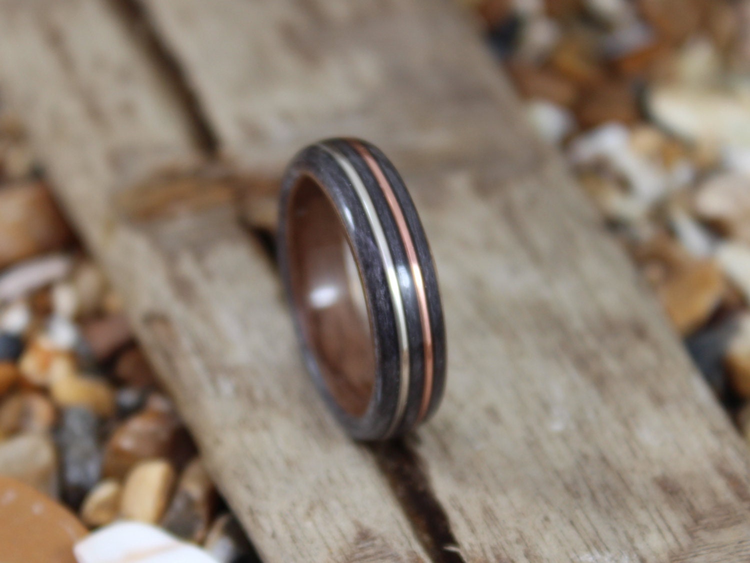 Walnut & Grey Maple with Copper and Silver Bent Wood Ring