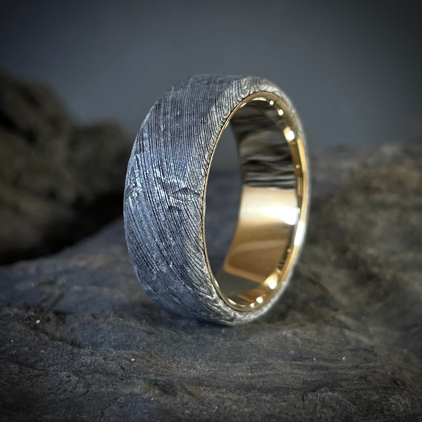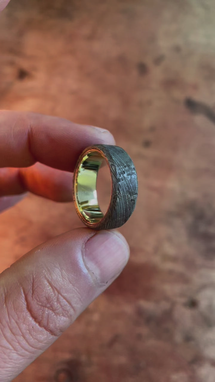 War torn Damascus Steel ring with 9 carat gold inside. Handmade to order in your size with free shipping worldwide.