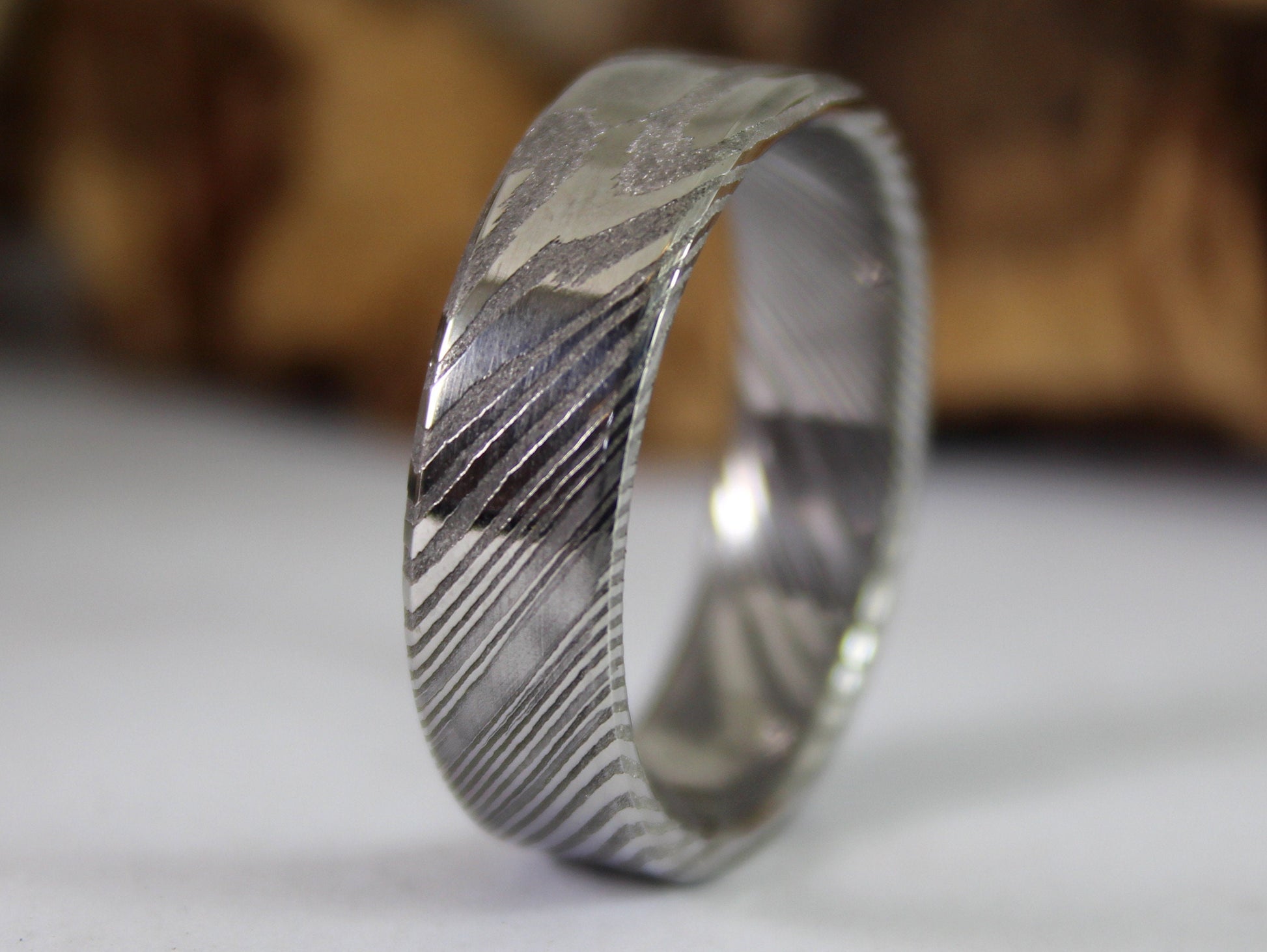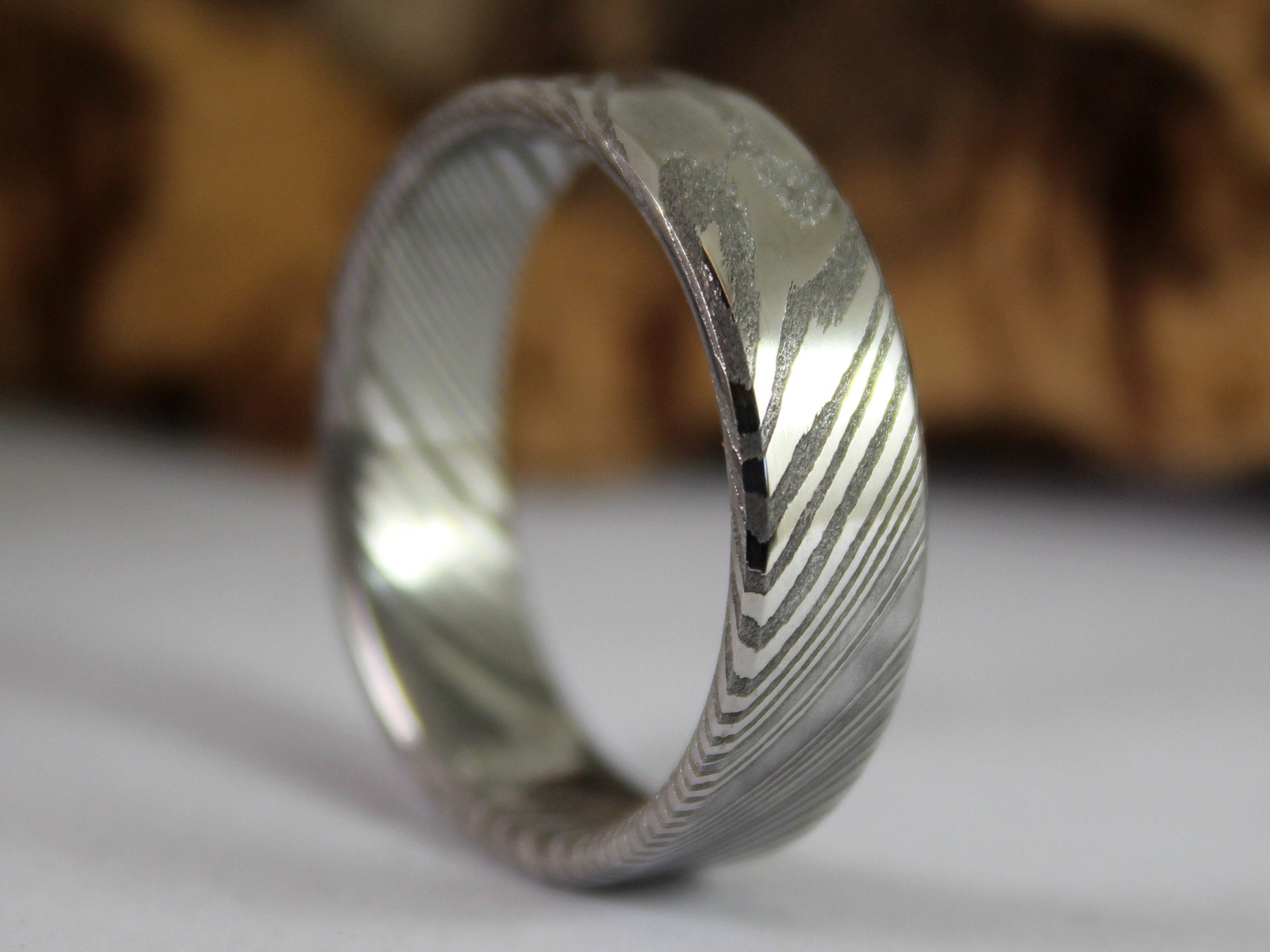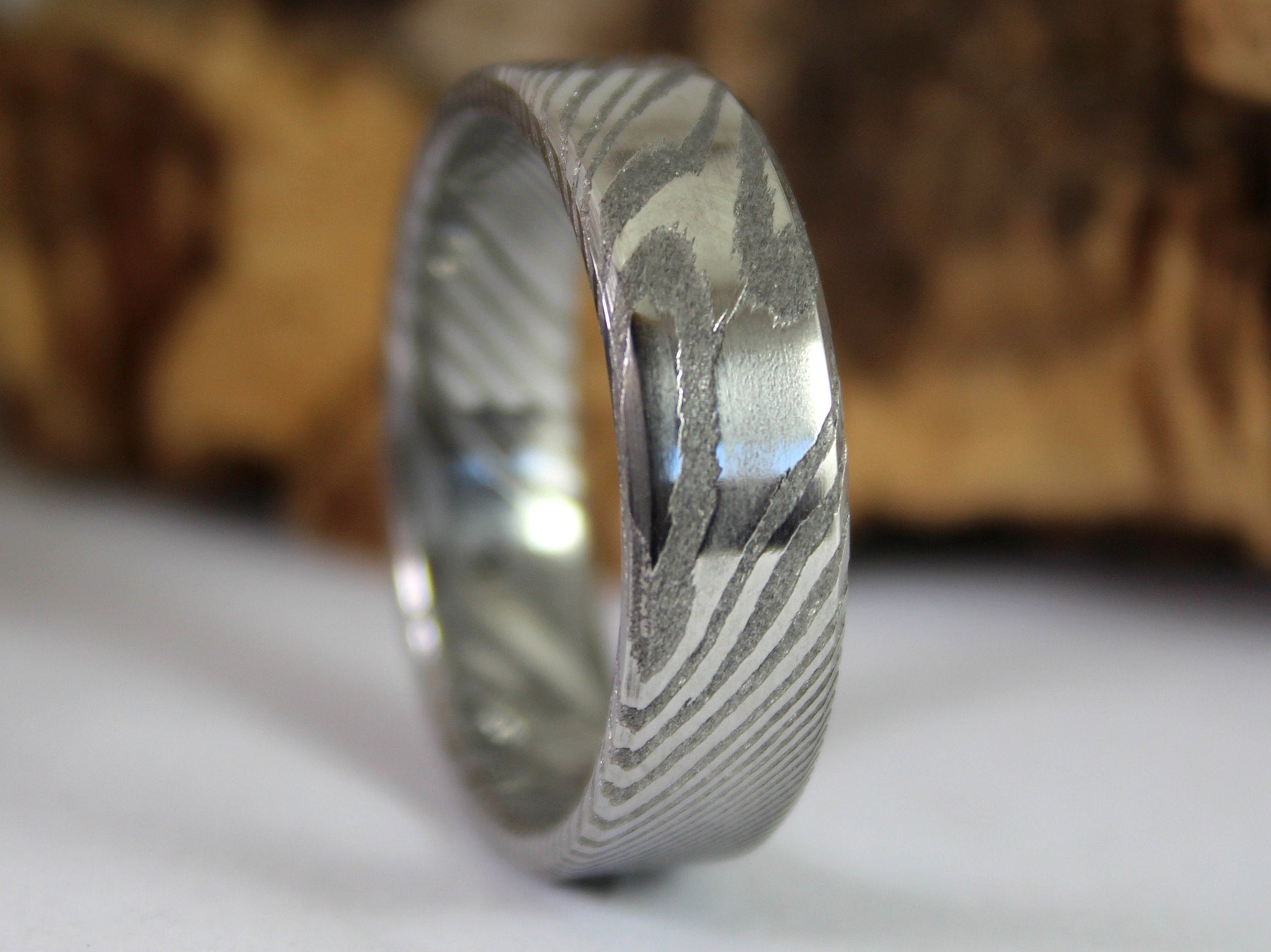 Wood Grain Damascus Steel Ring, Stainless Damascus Wedding Band