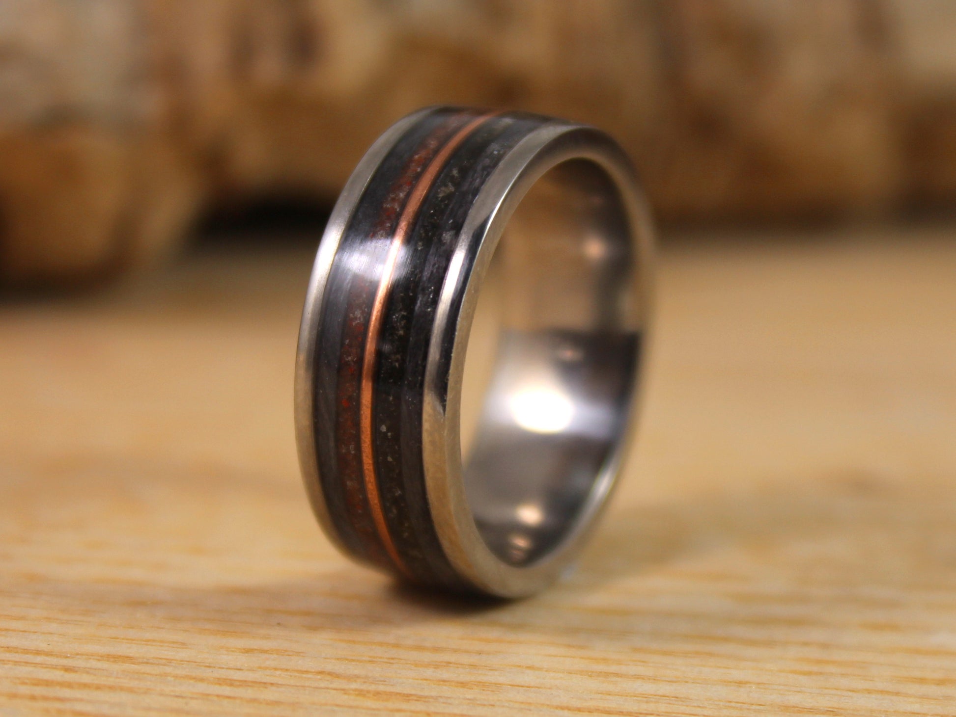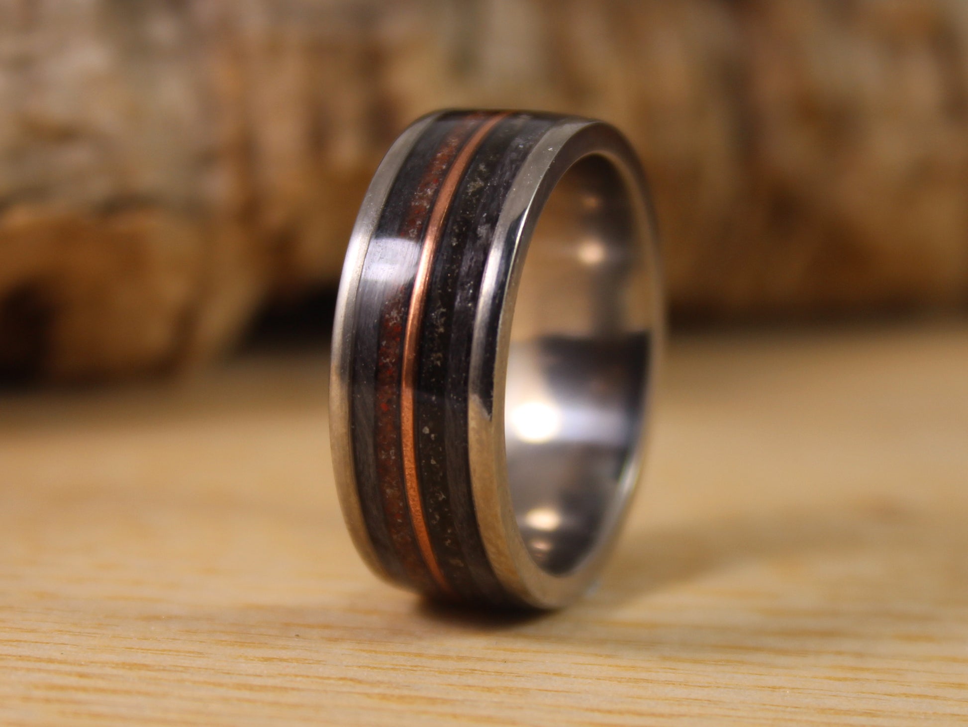 Steel Ring with Dinosaur Bone, Tektite Meteorite, Grey Maple and a Copper