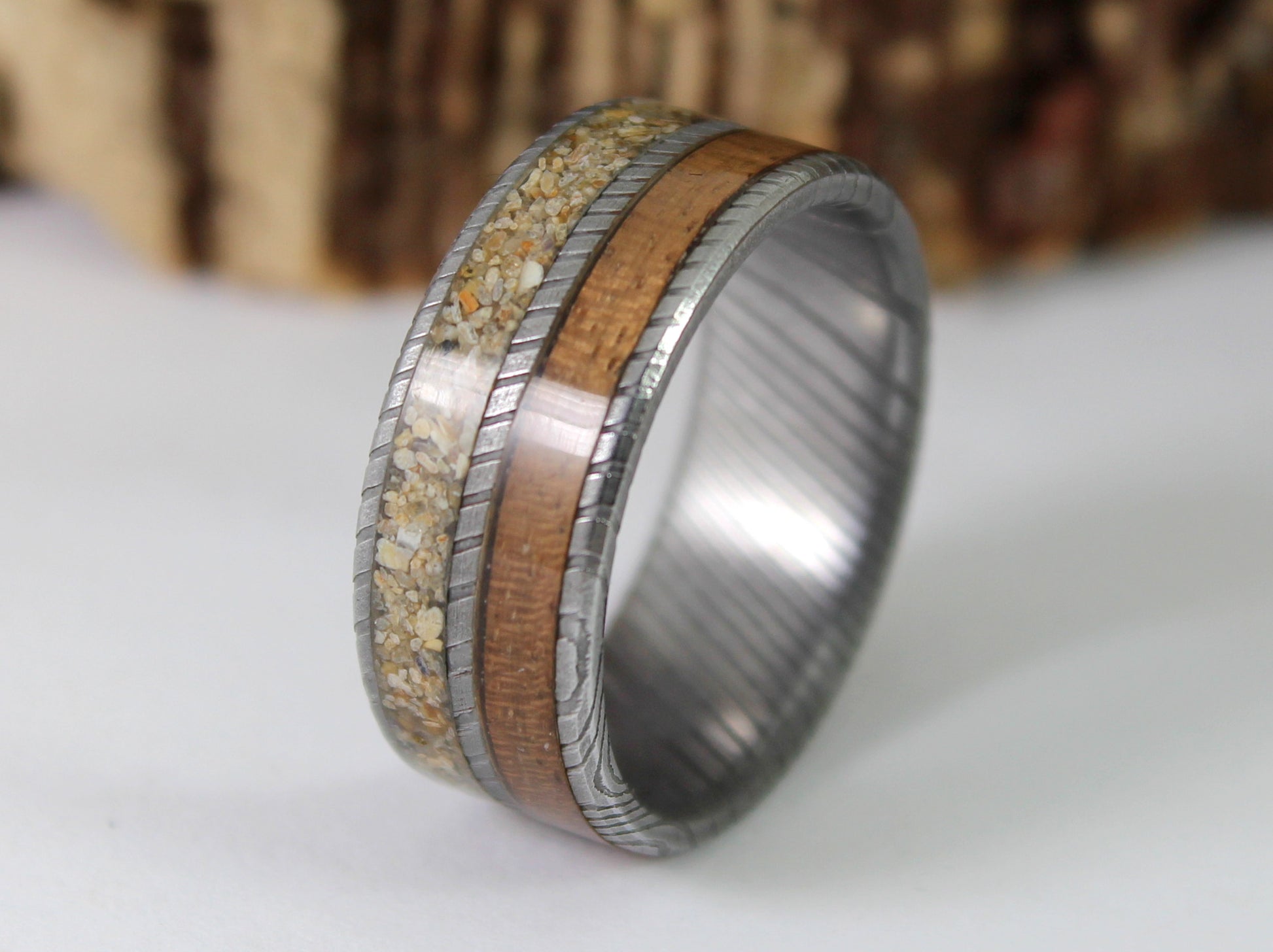 Damascus steel ring with Walnut from a WW2 Lee Enfield rifle and sand from Normandy landing beaches. These rings are handmade to order in any size.