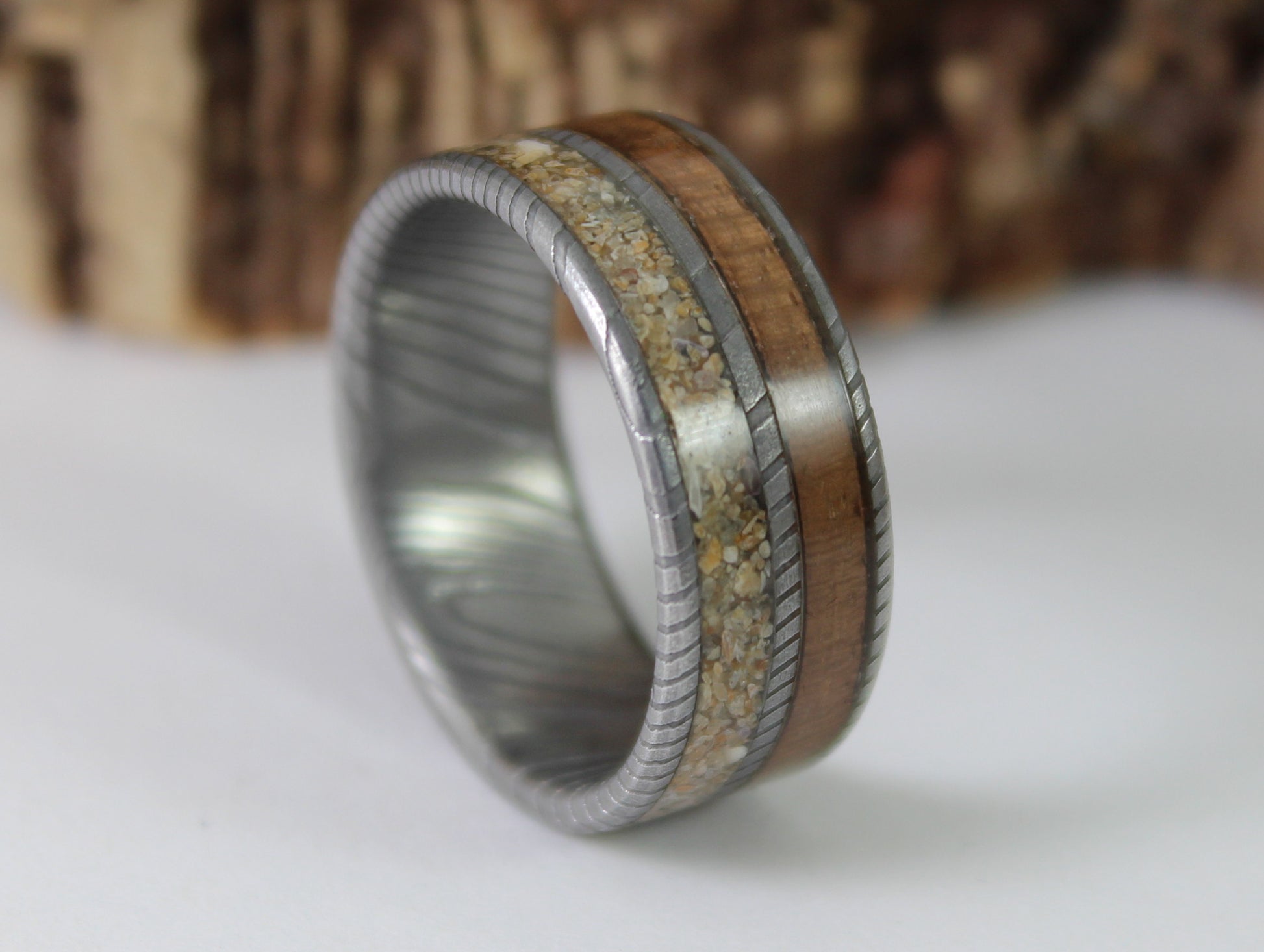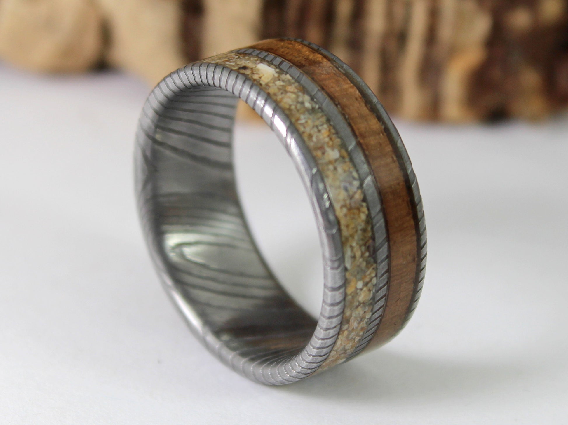 WW2 Ring: Damascus Steel, Lee Enfield Rifle Stock and Normandy Beach Sand