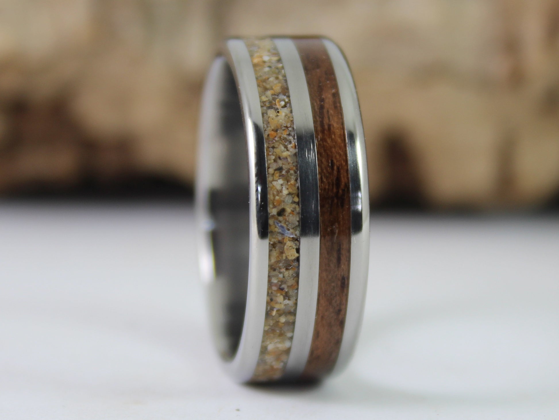 Sterling silver ring with Walnut from a WW2 Lee Enfield rifle and sand from Normandy landing beaches. These rings are handmade to order in any size.